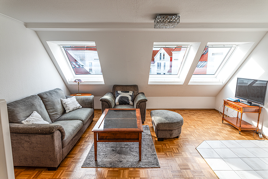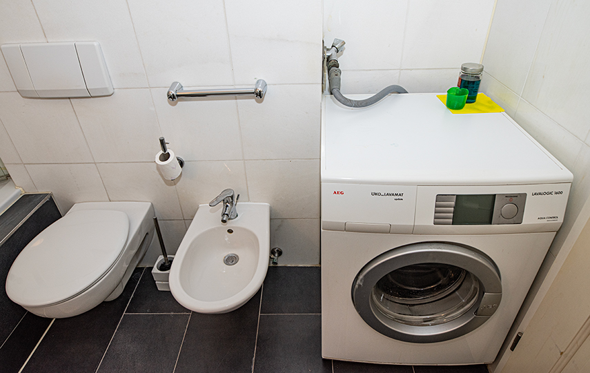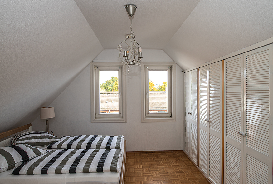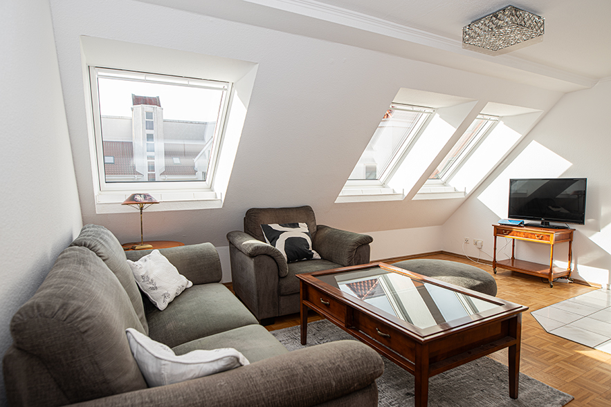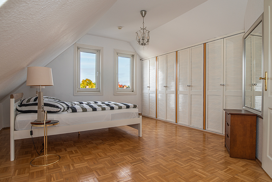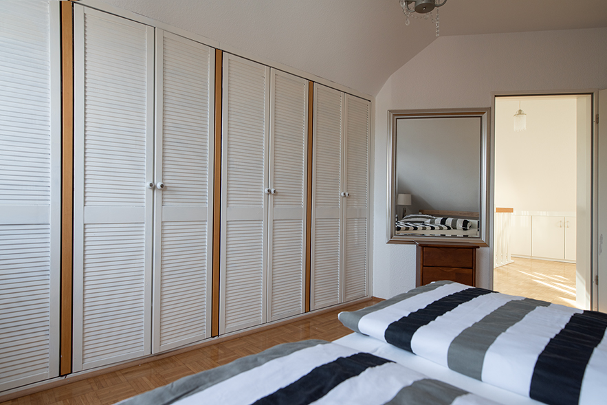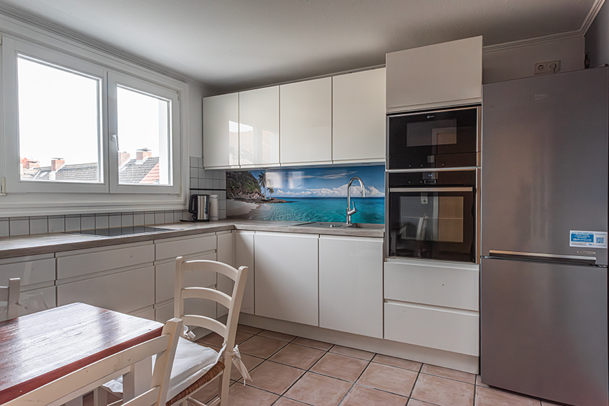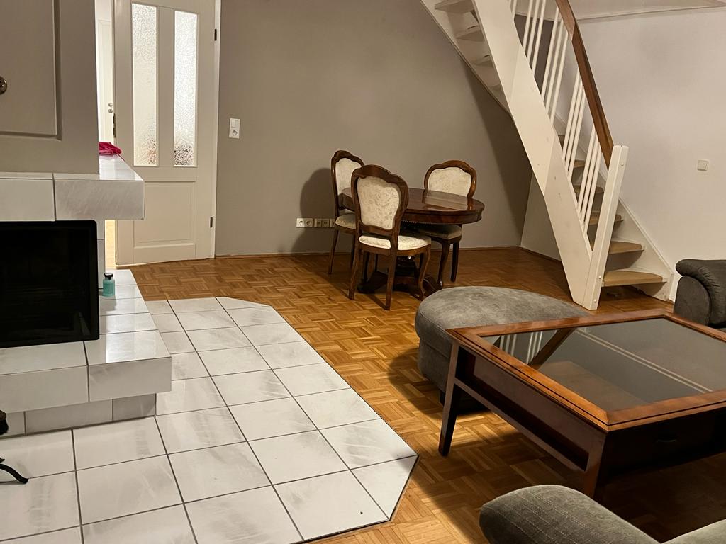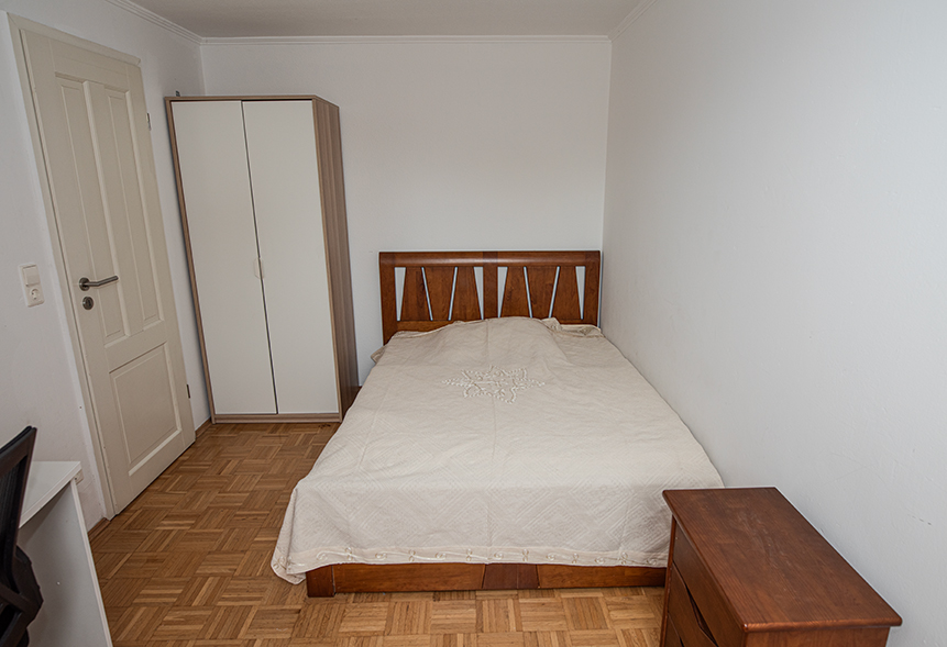 The living room is furnished with a sofa, armchair, coffee table, table and chairs and a fireplace. The separate kitchen has upper and lower cabinets, built-in sink, electric stove with ceramic hob (induction), oven, dishwasher, refrigerator with freezer compartment, kettle, coffee maker and crockery, pots, pans, cutlery. The bedroom has a comfortable double bed (140 x 200 cm), a spacious built-in wardrobe and a bedside table. Another bedroom has a double bed (120 x 200 cm) and a wardrobe and bedside table. The bathroom is equipped with a bath, washbasin, toilet and washing machine. The floor is covered in the living room and bedroom with an attractive parquet floor, bathroom and kitchen tiled floor. The apartment is heated by underfloor heating. Bed linen and towels are available to the tenant for use. In the basement, the tenant has the opportunity to use a parking space for the bicycle. In addition, if available the tenant can rent a parking space in the underground car park for € 50 per month. A drying room for clothes is available in the celler.