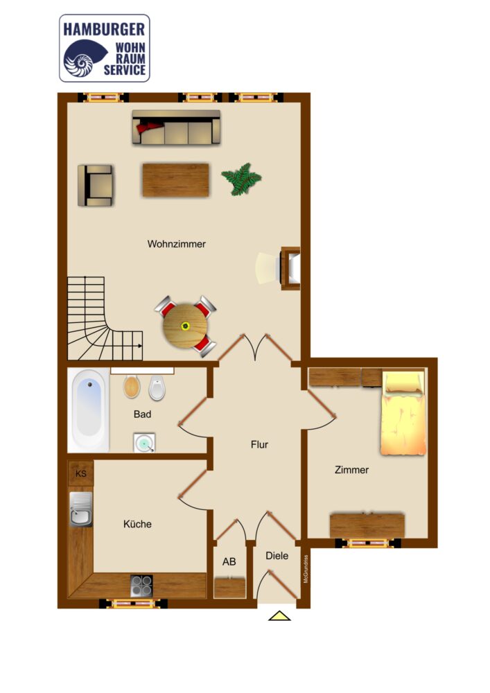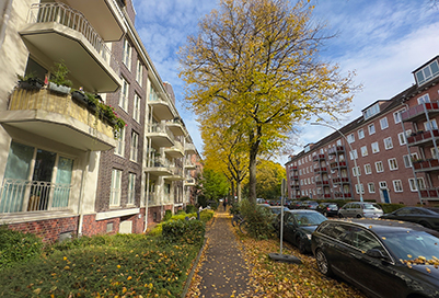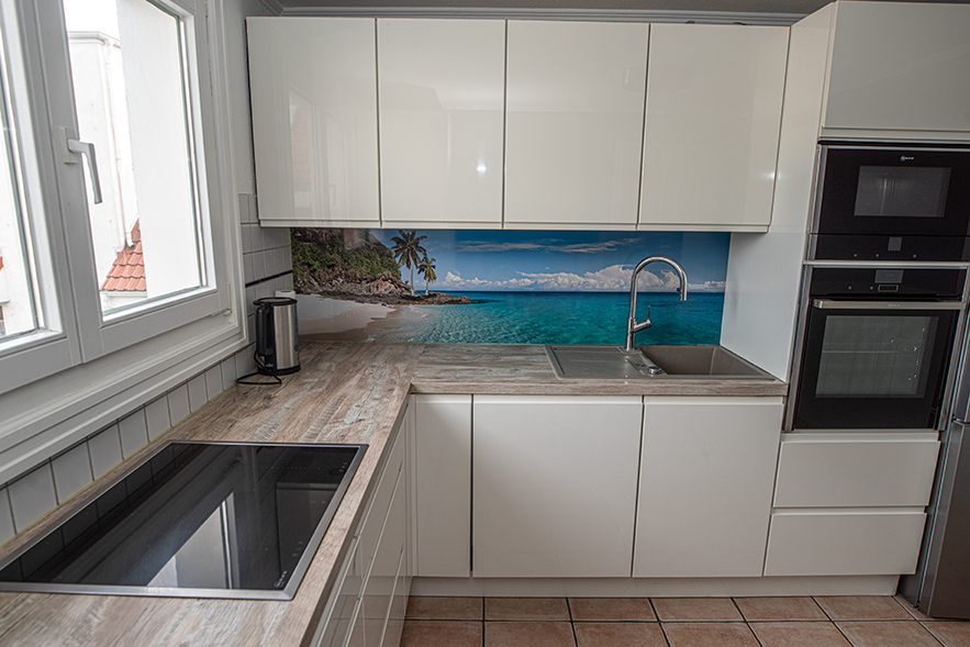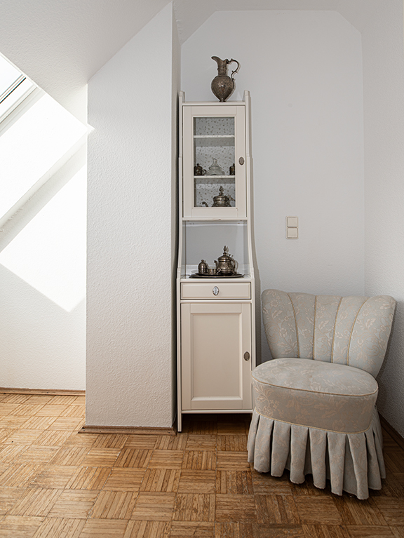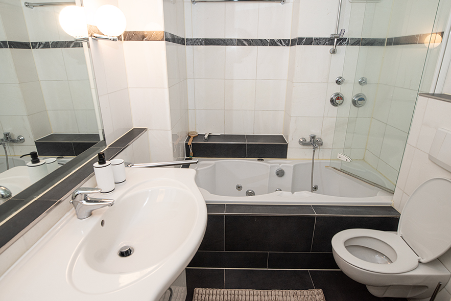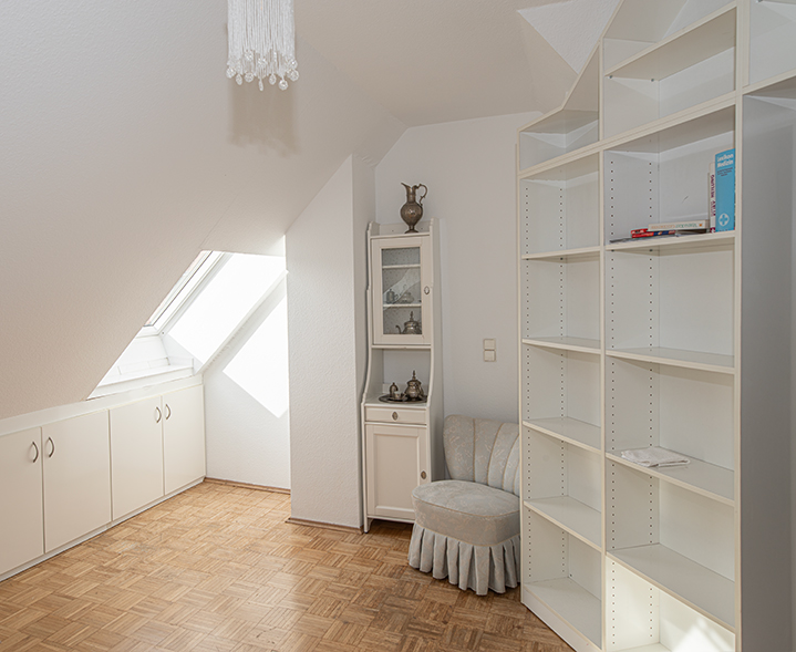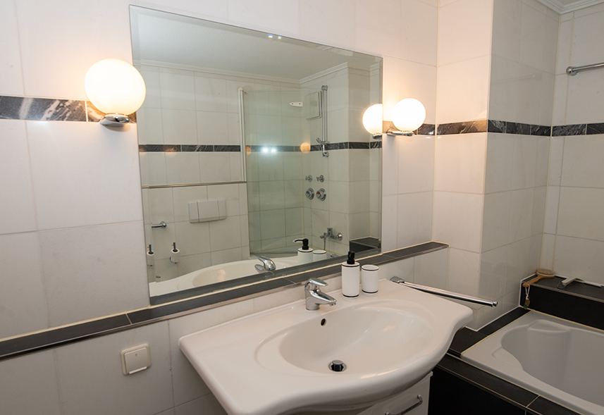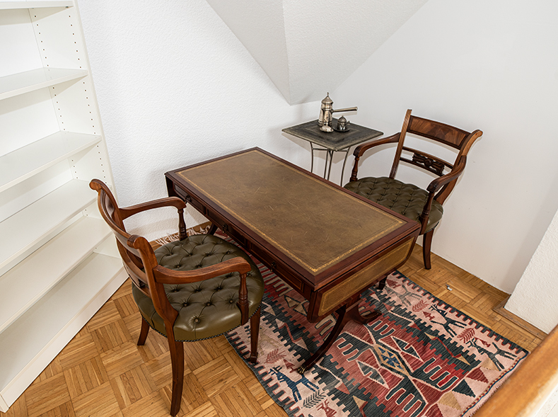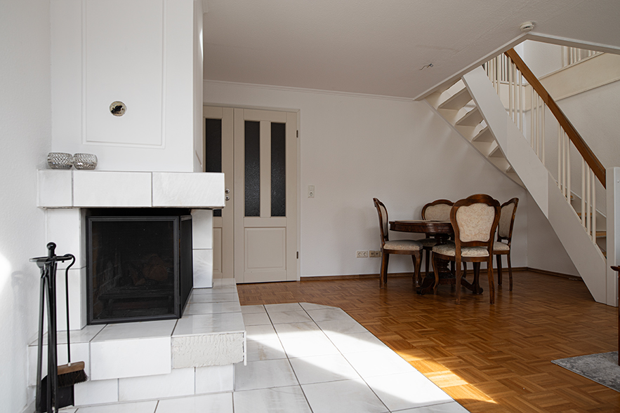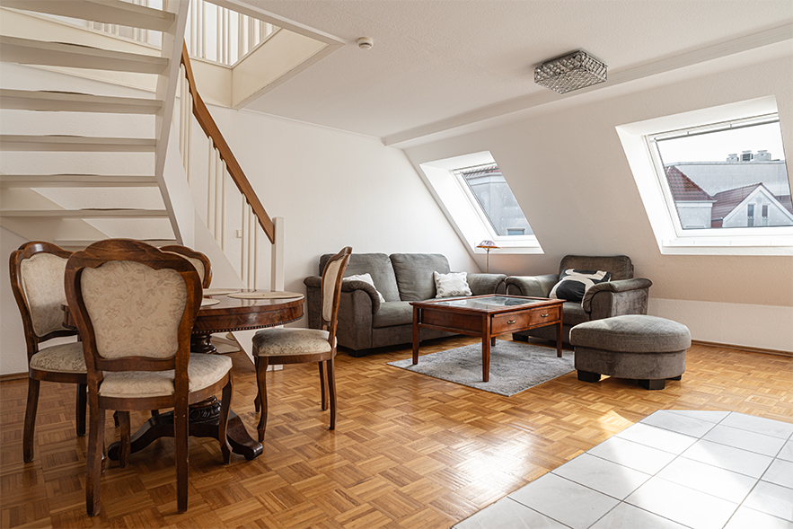 The living room is furnished with a sofa, armchair, coffee table, table and chairs and a fireplace. The separate kitchen has upper and lower cabinets, built-in sink, electric stove with ceramic hob (induction), oven, dishwasher, refrigerator with freezer compartment, kettle, coffee maker and crockery, pots, pans, cutlery. The bedroom has a comfortable double bed (140 x 200 cm), a spacious built-in wardrobe and a bedside table. Another bedroom has a double bed (120 x 200 cm) and a wardrobe and bedside table. The bathroom is equipped with a bath, washbasin, toilet and washing machine. The floor is covered in the living room and bedroom with an attractive parquet floor, bathroom and kitchen tiled floor. The apartment is heated by underfloor heating. Bed linen and towels are available to the tenant for use. In the basement, the tenant has the opportunity to use a parking space for the bicycle. In addition, if available the tenant can rent a parking space in the underground car park for € 50 per month. A drying room for clothes is available in the celler.