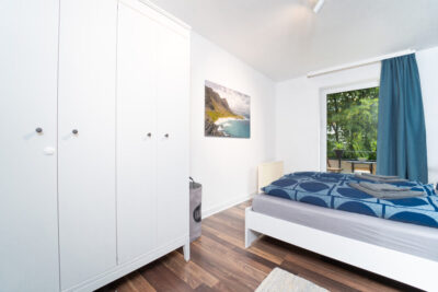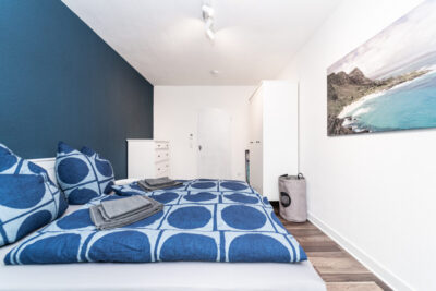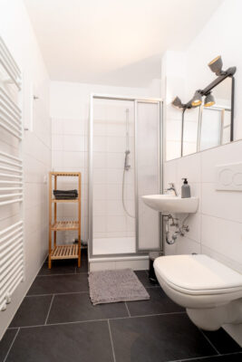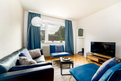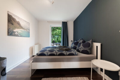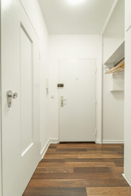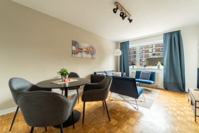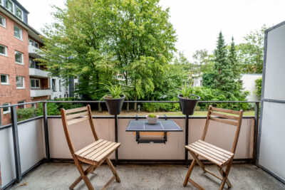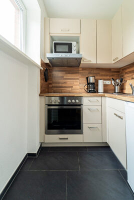 The living room is furnished with a comfortable seating area and a coffee table, floor lamp, TV table with flat screen TV and a small dining table with 4 chairs. The kitchen leads off from the living room and is equipped with a new, stylish built-in unit that has upper and lower cabinets, worktop, built-in sink, electric stove with ceramic hob and oven, extractor hood, refrigerator with freezer compartment, microwave as well as toaster, kettle, coffee machine, etc. The shower room is modern, tiled in white. The bedroom is furnished with a double bed (160 x 200 cm), wardrobe, chest of drawers and bedside table. From the bedroom you have access to the balcony.